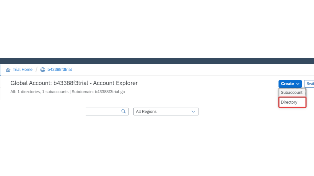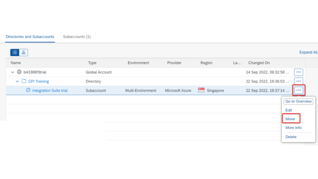 Enter a name for it and click on CREATE. To move the subaccount within the directory, click on the three dots or actions icon at the right end of the subaccount and choose MOVE.